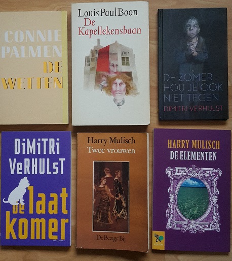 Andere literaire titels die ik in januari 2016 heb gekocht, zijn: De laatkomer en De zomer hou je toch niet tegen van Dimitri Verhulst, Twee vrouwen en De elementen van Harry Mulisch, De wetten van Conny Palmen en De kapellekensbaan van Louis Paul Boon.
